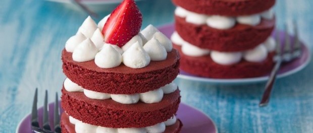 Cesto Red Velvet možno taktiež pripraviť viacerými spôsobmi. Ak hľadáte nenáročný dezert, štýlový na prezentáciu, zvoľte Red velvet vo vysokých sklenených pohároch s drobným červeným ovocím. V prípade, že chystáte narodeninovú oslavu pre najmenších, rozhodne zabodujete farebnými mini tortičkami alebo roztomilými cake pops. Cez víkendy vás nesklamú obľúbené a na prípravu jednoduché cup cakes.